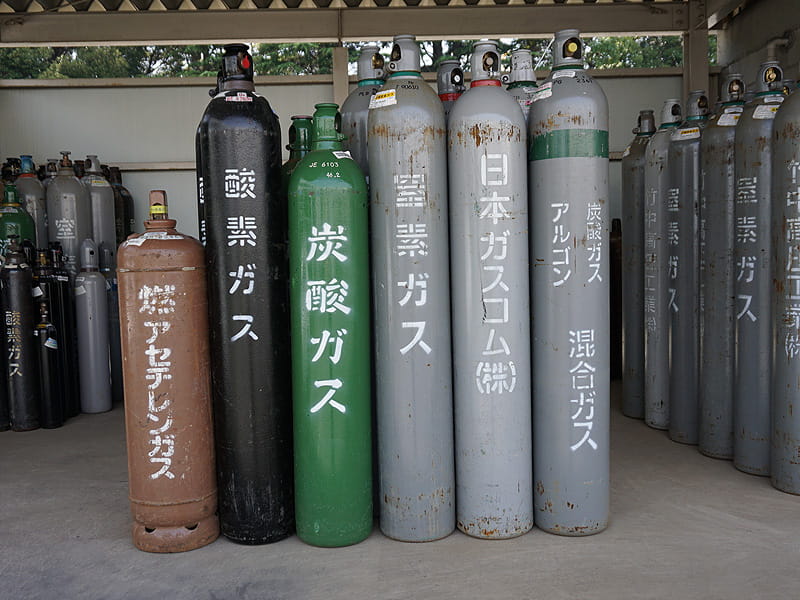 代表的なガスとしては、水素(H2)、ヘリウム(He)、酸素(O2)、窒素(N2)、炭酸(=二酸化炭素CO2)、アルゴン(Ar)、アセチレン(C2H2)などがあります。これらの気体または液体を高圧ガス保安法に照らし、その基準を超えるものを高圧ガスと定義し規制しています。
