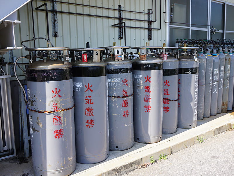 代表的なガスとしては、水素(H2)、ヘリウム(He)、酸素(O2)、窒素(N2)、炭酸(=二酸化炭素CO2)、アルゴン(Ar)、アセチレン(C2H2)などがあります。これらの気体または液体を高圧ガス保安法に照らし、その基準を超えるものを高圧ガスと定義し規制しています。